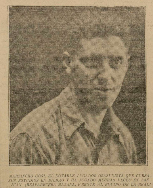 ¿Dónde fueron sus primeros pasos con el balón? Lo más lógico es pensar que lo hiciera en el colegio y en el instituto en Pamplona. En una fotografía fechada el 14 de abril de 1916, aparece junto a otros fundadores de Osasuna como Fernando Berazaluce, Pedro Manso y Alberto Lorenzo Lamas. En aquella época, Martín vivía en la calle San Miguel, 16, con sus hermanas Alejandra y Juana, y sus padres, el matrimonio formado por Aniceto Goñi y Petra Guillenea. El hermano mayor, Anselmo, estaba casado.
