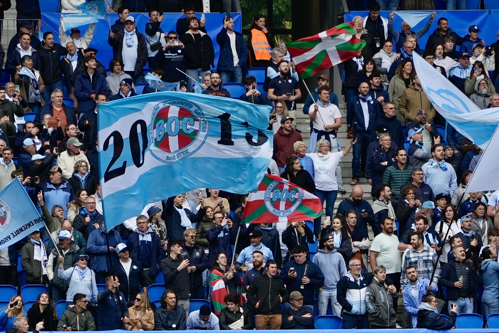 Tampoco ha faltado a la cita la parroquia de la Section Paloise, con sus banderolas y bufandas verdes, y el escudo de las dos vacas rojas sobre fondo amarillo del Bearn, copando sobre todo la zona de la grada familiar. Hace dos años se llevaron la victoria de la capital guipuzcoana y venían con ganas de repetir.