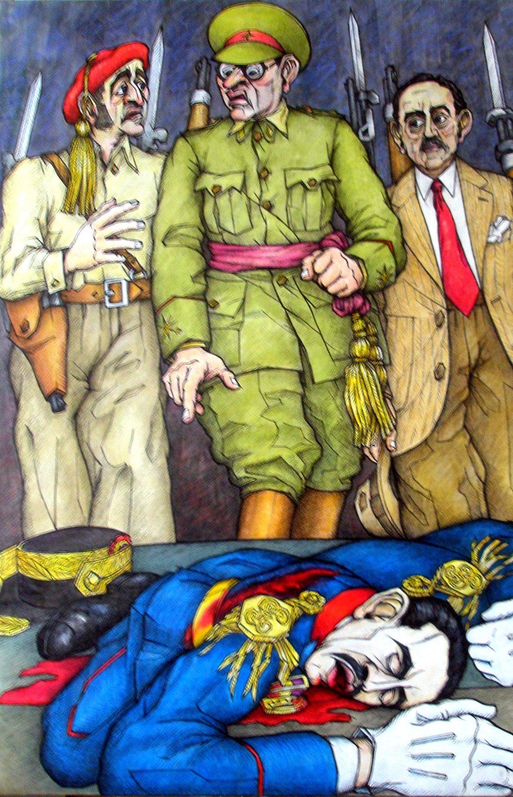 «En el cuadro se ve, además del cadáver, al propio Mola, a Garcilaso y el carlista Baleztena. Me baso en una foto documentada del día 19 de julio durante un paseo triunfal que se dieron los tres. Lo que hago es fingir que se topan con Rodríguez-Medel, aunque a este lo mataron el día anterior», explica el autor.