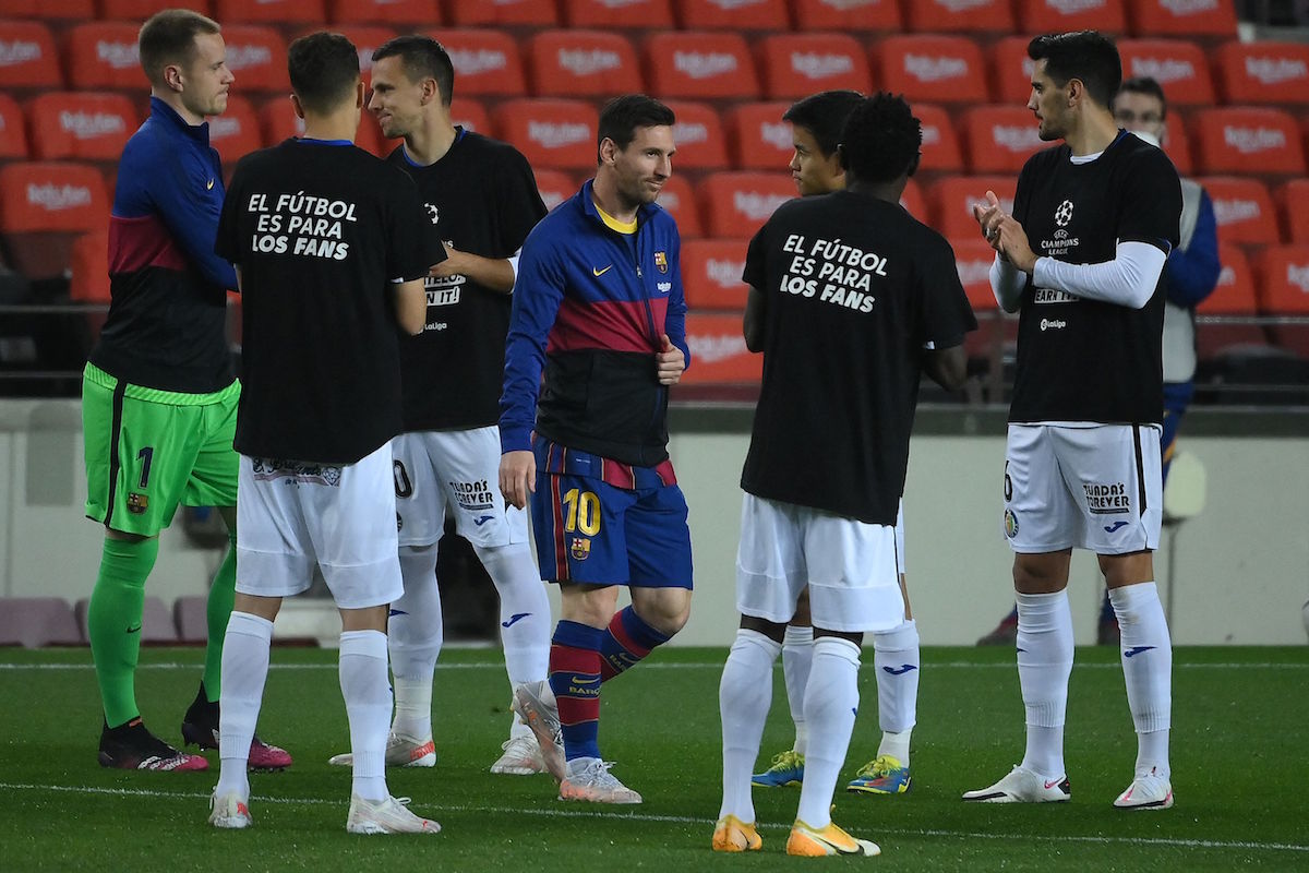 Pasillo del Getafe al Barcelona por haber ganado la Copa. Los madrileños visten camisetas en contra de la Superliga ante uno de los clubes impulsores. (Lluis GENÉ / AFP)