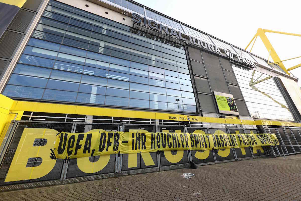 Pancarta contra la UEFA y la Federación Alemana en el Signal Iduna Park de Dortmund, acusándoles de «hipócritas» por «jugar el mismo juego» que los impulsores de la Superliga. (CHRISTOF KOEPSEL / AFP)