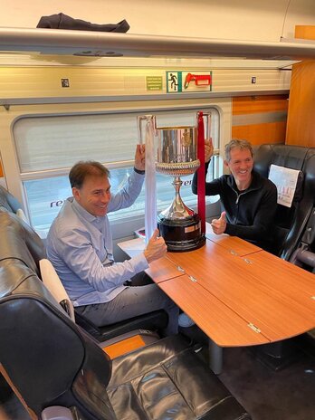Rafa Martín Vázquez y Jon Andoni Goikoetxea posan con la Copa durante su viaje a Sevilla.