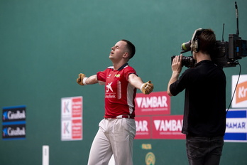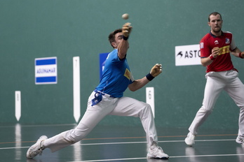 Peio Etxeberria se dipones a golpear la pelota ante la presencia cercana de Artola.