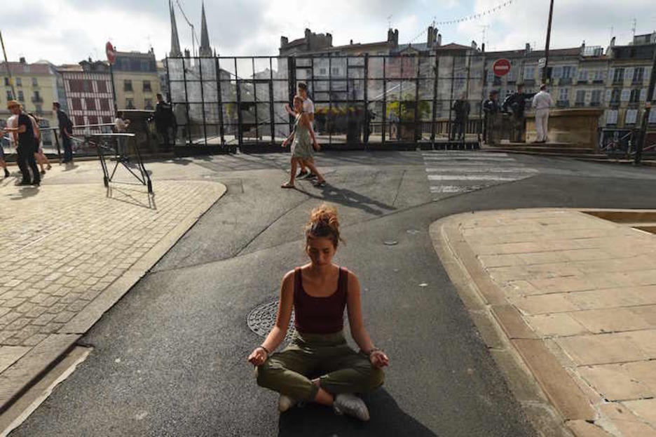 Una mujer, sentada en una calle, junto a uno de los puentes bloqueados por la Policía. (Gaizka IROZ/AFP)