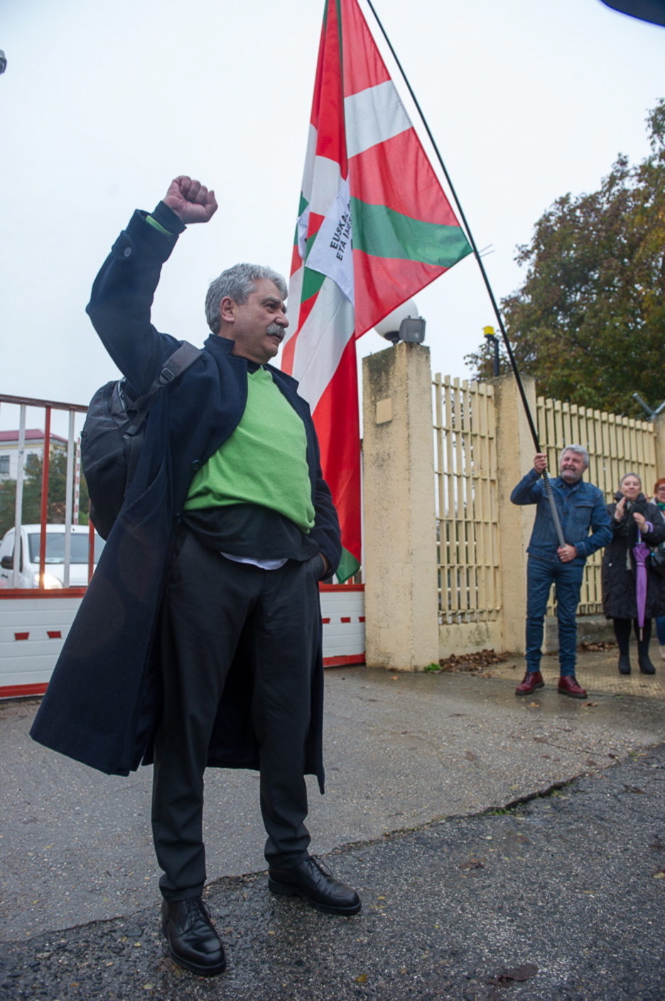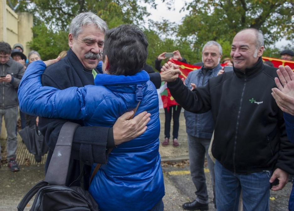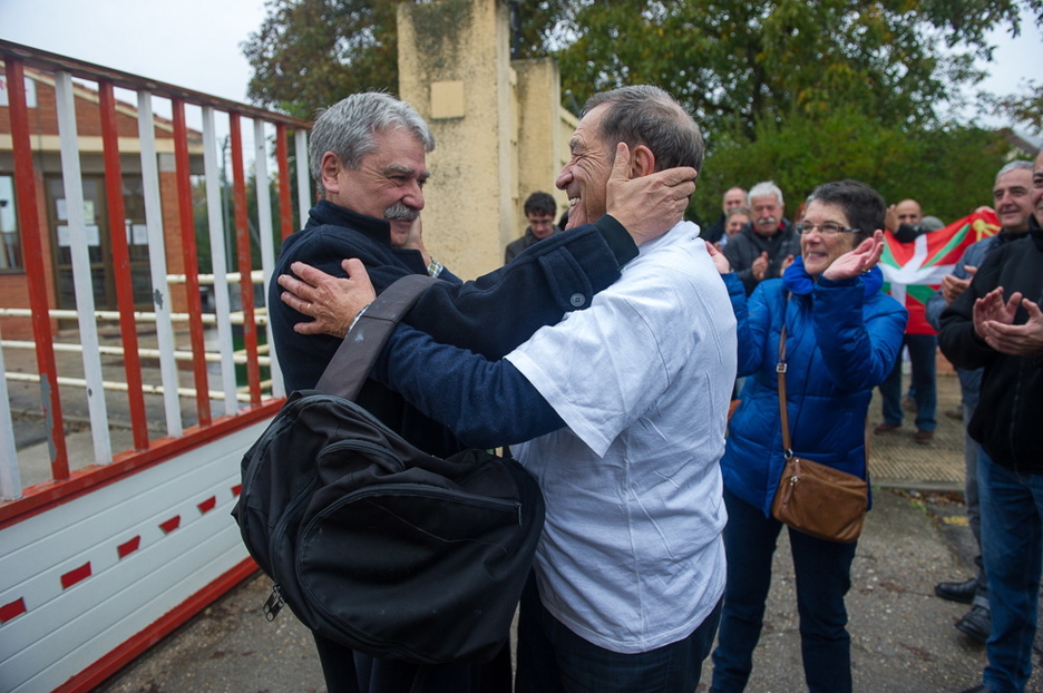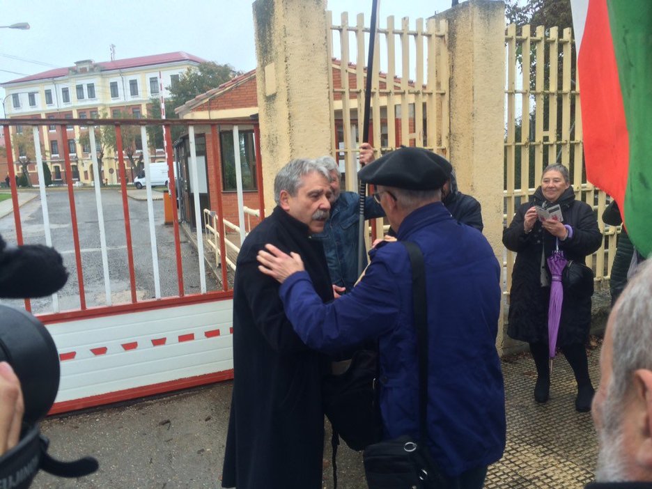 Jabier Salutregi kalean da Burgoseko espetxetik atera eta gero. EGINeko azken zuzendariak zazpi urte baino gehiago eman ditu preso. 10:30ak inguruan berreskuratu du askatasuna eta espetxeko atarian zain zituen senide, lagun eta lankide ohi ugarik egin diote harrera.