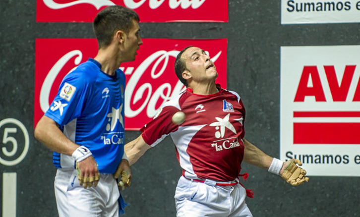 Aunque ninguno de los dos hizo excesivo daño con su saque, sí que el cambio de pelota trajo consigo un nuevo escenario. Irujo revolucionó en su día el mano a mano con sus posturas, pero ayer, por eso de no forzar la zurda, renunció a restar de aire y su rival lo aprovechó para venirse arriba gracias al saque-remate. Hubo momentos en los que parecían jugar con los papeles cambiados, entrando más de aire el vizcaino e intentando jugar más largo Irujo y el partido se igualó en su ecuador (11-11).