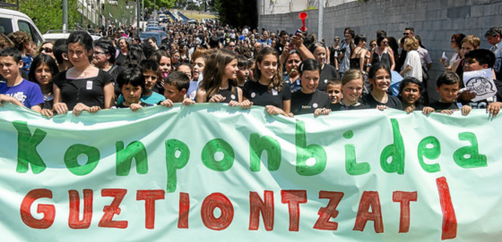 El representante de ELA efectuó esas declaraciones en el transcurso de la movilización que protagonizaron dos centenares de alumnos, profesores y progenitores detrás de una pancarta con el lema ``Ibaigane. Konponbidea guztiontzat!!''. Vestidos con camisetas negras, corearon consignas como «Ibaigane no se vende, Ibaigane se defiende», «recolocación es la solución», «borroka da bide bakarra», «no al cierre» e «Ibaigane aurrera».