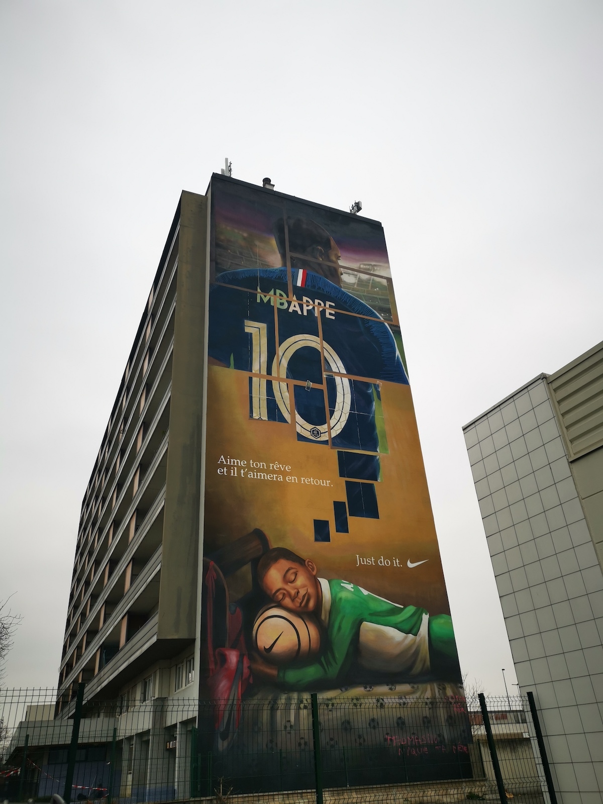 Uno de esos murales que ver en Bondy es sin duda la imagen inmensa de Mbappé, que ocupa la fachada entera de un bloque de diez plantas, en las afueras de la barriada. No es una obra «gratuita», sino la iniciativa de un sponsor muy potente en el mundo de la ropa deportiva.